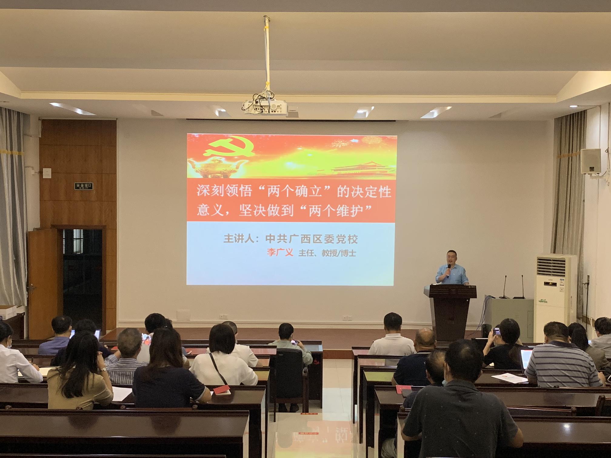 两支部邀请到中共广西区委党校(广西行政学院)哲学教研部主任、广西壮族自治区党委讲师团特聘专家李广义教授讲授以《深刻领悟“两个确立”的决定性意义,坚决做到“两个维护”》为主题的党课,深入学习党的二十大精神。李教授从“两个确立”决定性意义的理论和实践逻辑;完整准确把握“两个确立”的内涵要求;坚持“两个确立”,做到“两个维护”,开创新时代壮美广西建设新局面三个方面,深刻解读了“两个确立”和“两个维护”重要意义。党员教师参会党员专心听讲,认真记录。