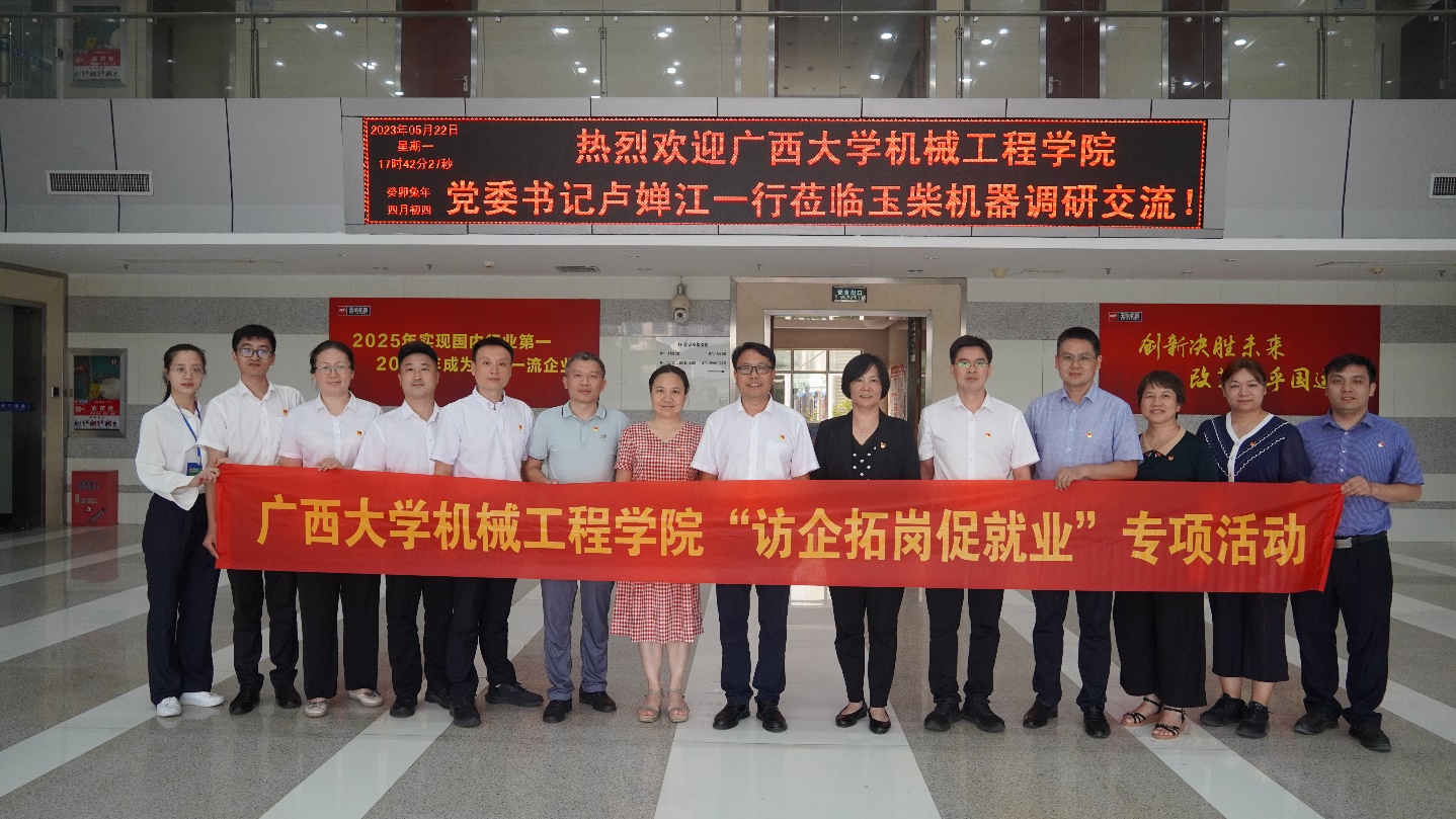 为深入贯彻党中央、国务院关于高校毕业生就业工作的决策部署,推进访企拓岗促就业专项行动,全力促进高校毕业生高质量就业,5月22日,学院党委书记卢婵江、党委副书记黄路明、副院长贺德强、黄豪中、李俚、高欲垚,院长助理兼能源与动力工程系主任欧阳天成一行7人到玉柴机器研发总院走访调研,开展“访企拓岗促就业”专项活动。玉柴机器研发总院党委书记兼常务副院长寇传富,副院长兼新材料与摩擦润滑中心主任覃星念、党委副书记姜博、院长助理兼中重动力平台部主任向本杰、院长助理兼电控与智能化中心主任叶宇、轻动力系统部主任王春玲、运营管理部副主任周益善等参加调研活动。双方一同参观了玉柴机器集团位于南宁高新区的研发基地,详细了解企业的发展历程、生产经营现状、人才结构及关键技术攻关需求等方面的情况。在走访中,学院领导和老师积极向企业推荐3044永利集团官网毕业生,了解企业的人才需求,深度了解企业对毕业生的知识、能力、素质要求,认真分析所在行业的发展趋势和人才需求形势,以作为不断增强人才培养的针对性和适应性的重要参考。