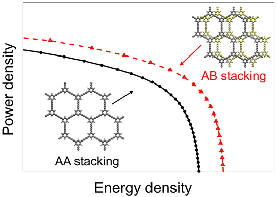 超级电容器具有充电快、功率高等优点,在新能源汽车、国防军事等领域的储能中扮演着重要角色。但与电池相比,如何在维持其高功率密度的同时提升能量密度是当前超级电容器研发的痛点。常见的多孔电极材料(如活性炭、碳化物衍生碳等)可以增加超级电容器的能量密度,但其无序的离子通道降低了其功率密度;导电多孔二维材料具有周期性的晶体结构和有序的离子通道,有助于提高超级电容器的充电速度和功率密度,但其比表面积值还相对较低,因此限制了超级电容器的能量密度;氢取代石墨二炔是一种新型的多孔二维材料,具有比表面积大、物理性质稳定等优点;多孔石墨炔独特的sp和sp2的碳杂化轨道使其具有可调节的电子结构和孔道结构,为超级电容器的机理研究与性能优化提供了理想的平台,因此在能源储存领域具有广阔的应用前景。目前研究表明,氢取代石墨二炔具有不同的堆叠方式和不同的金属性,将会深刻影响超级电容器的储能性能,但对这些拓扑结构与金属性所产生的具体影响及其机理还不清晰,目前需要学界深入探索。