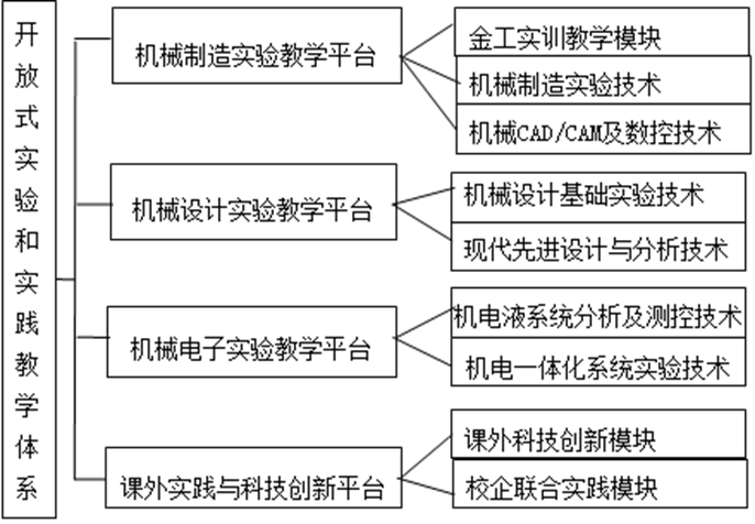 2006年由机械基础实验室和金工实习中心整合成立的机械工程基础实验教学中心评为首批区级实验教学示范中心。为适应新世纪人才培养和专业建设发展的需要,中心进一步融入了专业实验室,更名为机械工程实验教学中心。2007年11月中心以免答辩形式评为国家级机械工程实验教学示范中心,2013年1月以优异成绩通过验收专家组验收;2014年被评为国家级机械工程虚拟仿真实验教学中心。中心以培养学生的创新设计能力和综合设计能力为教学目标,紧密结合机械工程发展的前沿技术和中心教师科学研究的成果,进行实验教学体系、内容、手段和方法的改革,构建涵盖本科教育全过程完整的层次化、模块化实验教学体系。形成了与理论教学体系既有机结合又相对独立的4个教学平台9个教学模块开放式实验和实训教学体系。